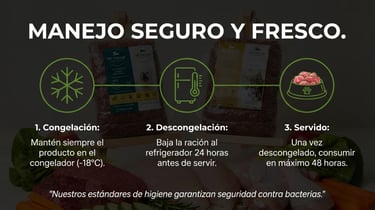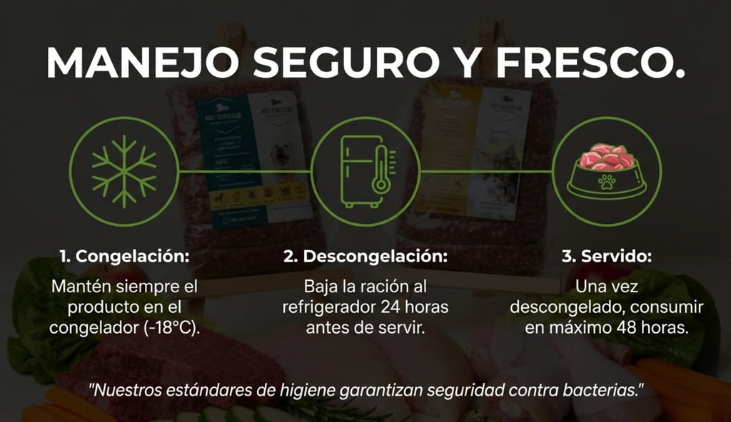Es una preocupación válida. Sin embargo, el sistema digestivo de los perros y gatos está diseñado para manejar bacterias presentes en la carne cruda, gracias a su corto tracto digestivo y su acidez estomacal. Para los humanos, la clave está en seguir buenas prácticas de higiene, como lo harías al manipular cualquier tipo de carne cruda. Recomendamos lavar bien tus manos, superficies y utensilios después de la preparación de los alimentos.