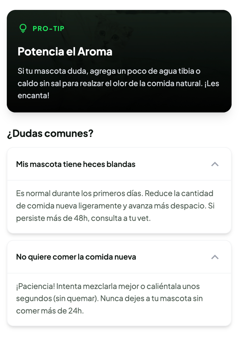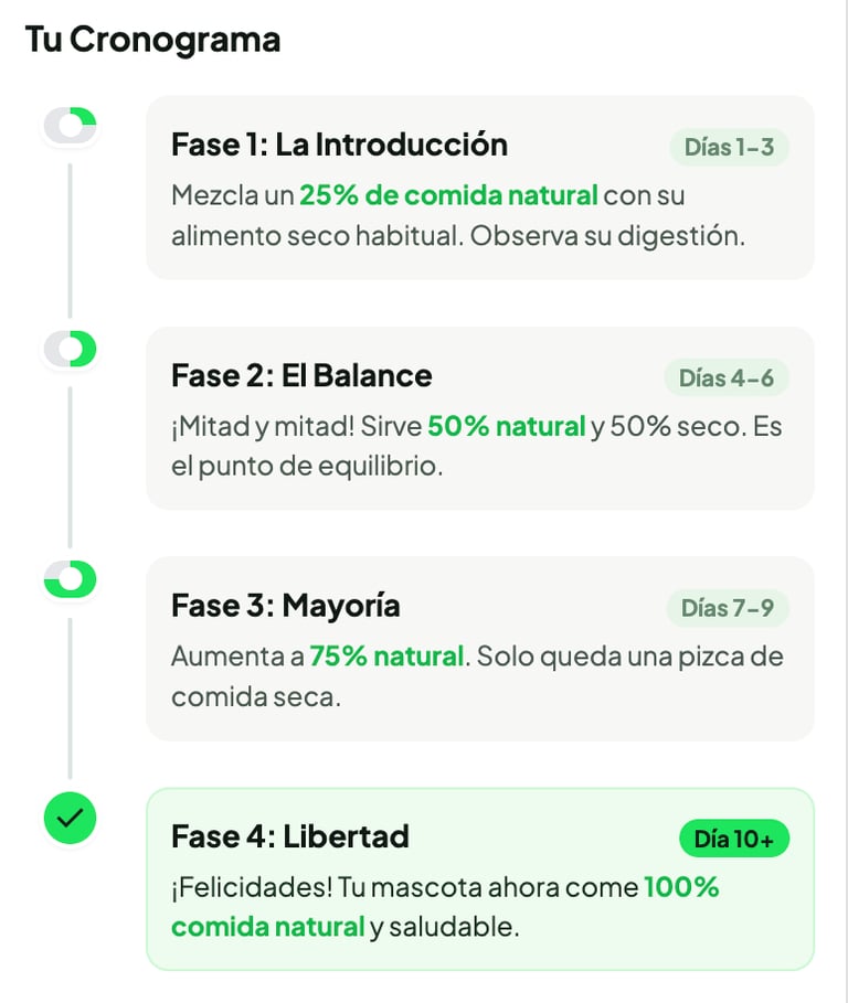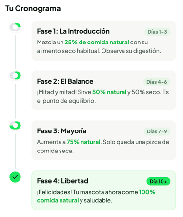 En la mayoría de los casos la transición es inmediata, generalmente a los perros y a los gatos les encanta, pero no a todos, con mayor frequencia algunos gatos y uno que otro perro, necesitan un periodo de adaptación. En esos casos les sugerimos este Cronograma para una transición feliz y sin problemas.