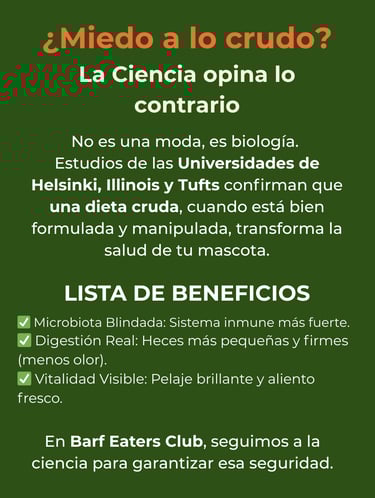 En Barf Eaters Club, entendemos tu preocupación porque nosotros también estuvimos ahí. Sin embargo, tras investigar a fondo la dieta ancestral propuesta por el veterinario Ian Billinghurst, descubrimos que el verdadero riesgo no es la comida cruda, sino la comida industrial que no respeta su naturaleza.